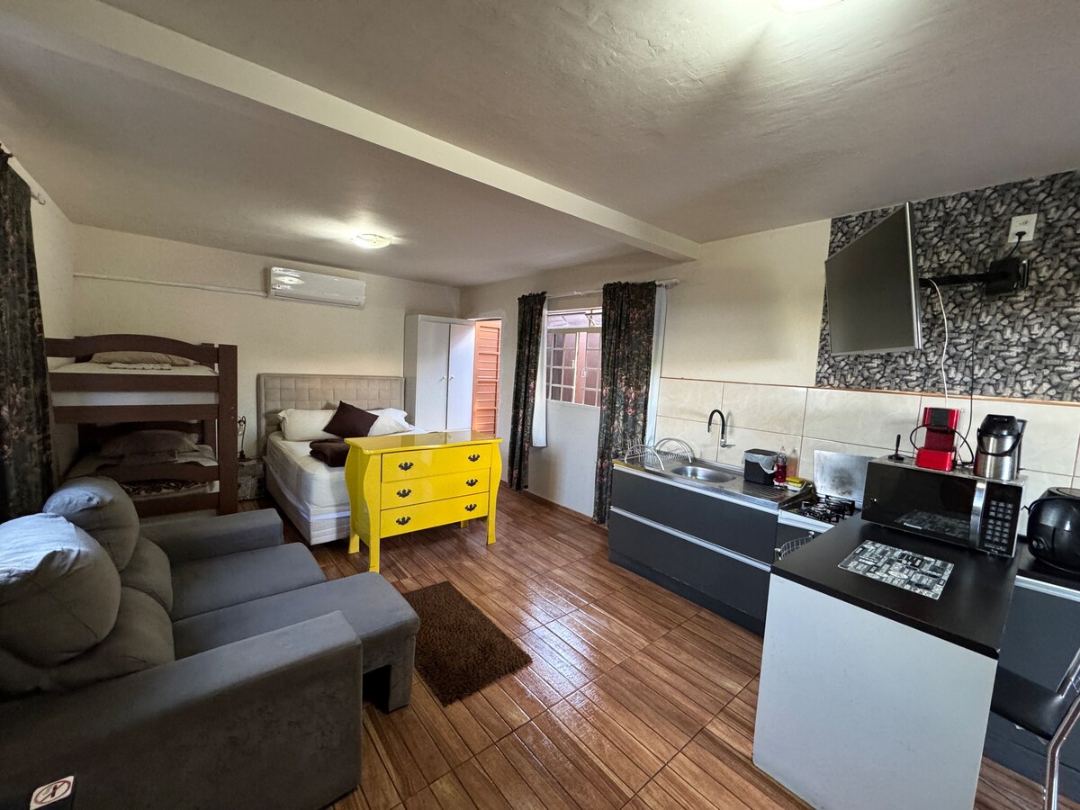 Nosso loft foi pensado para oferecer conforto, praticidade e uma sensação incrível de liberdade. O espaço é todo aberto, sem divisórias entre os cômodos (com exceção do banheiro e área de serviço), o que garante um ambiente amplo, arejado e acolhedor. 📍 Estamos a apenas 5 minutos do centro de Ponta Grossa e com fácil acesso às principais rodovias da região — ideal para quem quer estar bem localizado, sem abrir mão da tranquilidade. 🌄 Da sacada, você poderá apreciar uma vista linda da cidade