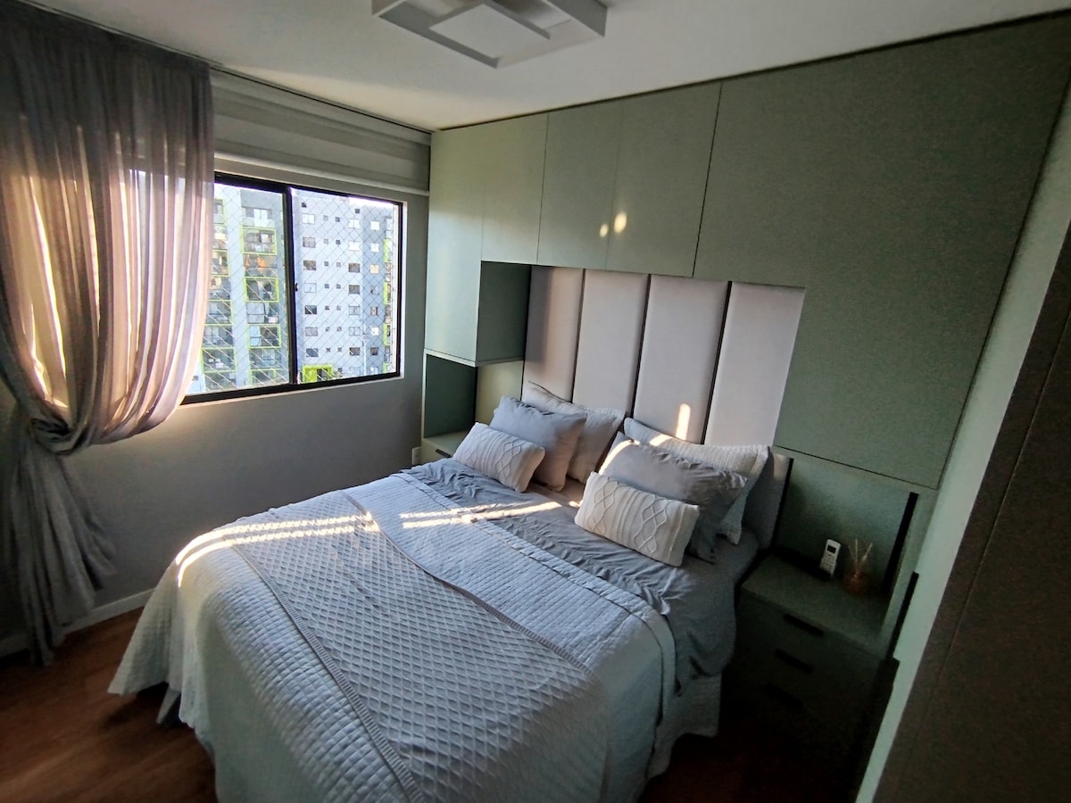 Procurando um lugar para trabalhar, descansar ou explorar a cidade? Nosso apartamento é perfeito para você! Com 2 quartos, Wi-Fi de alta velocidade, espaço de trabalho e um ambiente tranquilo garantem produtividade e relaxamento. Além disso, temos garagem privativa e segurança 24 horas para você ficar tranquilo. A decoração foi cuidadosamente planejada para criar um ambiente acolhedor, com um toque especial: um mapa-múndi na parede que te fará viajar sem sair do lugar. Seja bem-vindo!