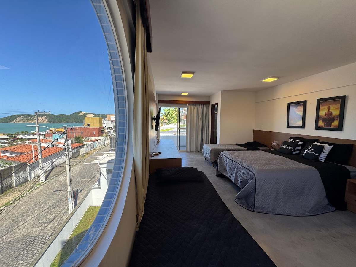 Apartamento único com vista total do mar, propriedade com a cesso a praia e além de uma ótima piscina para adultos e crianças com Decker de madeira que dá visão para o morro do careca , ar apenas no Quarto, geladeira , forno , fogão, liquidificador, ferro passar , Tv a Cabo , wi-fi , estacionamento rotativo, limpeza diária lugar realmente ótimo para casal passar seu final de semana ou suas férias .