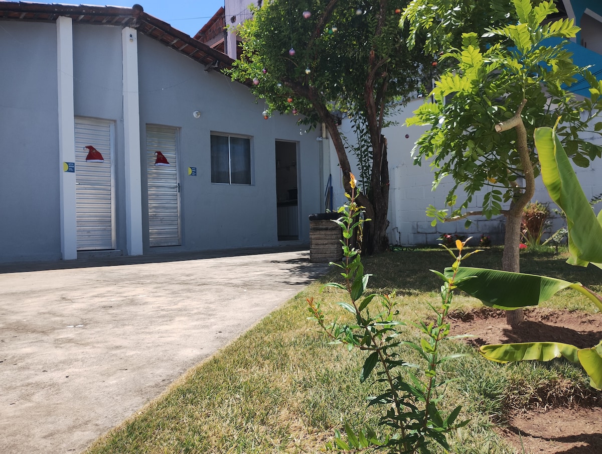 Casa aconchegante em Ponta Negra, muito bem localizada, próxima ao praia shopping, restaurantes, bares, padarias, mercados, entre outros. A casa contém uma área externa com jardim/terraço. Ao entrar, a cozinha e a sala são um espaço inteiro, sem divisórias. A cozinha é equipada com todos os utensílios básicos necessários para cozinhar e a sala dispõe de sofá-cama e decoração moderna. O quarto tem uma cama de casal, armador de rede, SmarTV e ar-condicionado. O banheiro dispõe de água quente.