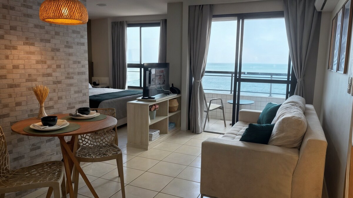 Acorde com uma vista espetacular para o mar no 6º andar do Paradise Flat! Apartamento completo e acolhedor, com cama king, ar-condicionado novo, Wi-Fi veloz, Smart TV e cozinha equipada. Ideal para descansar ou trabalhar com conforto. Piscina, sauna, limpeza inclusa e recepção 24h. Localização privilegiada, perto dos melhores restaurantes e comércios. Viva dias incríveis com praticidade, charme e segurança!