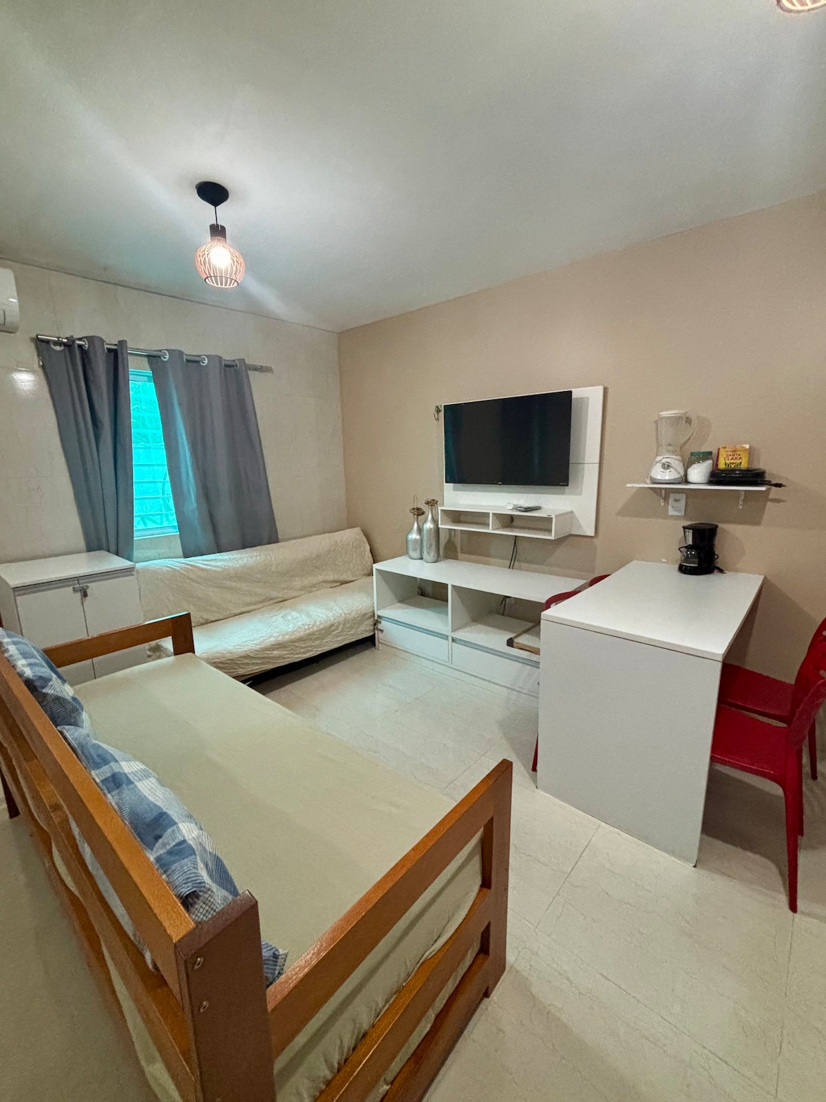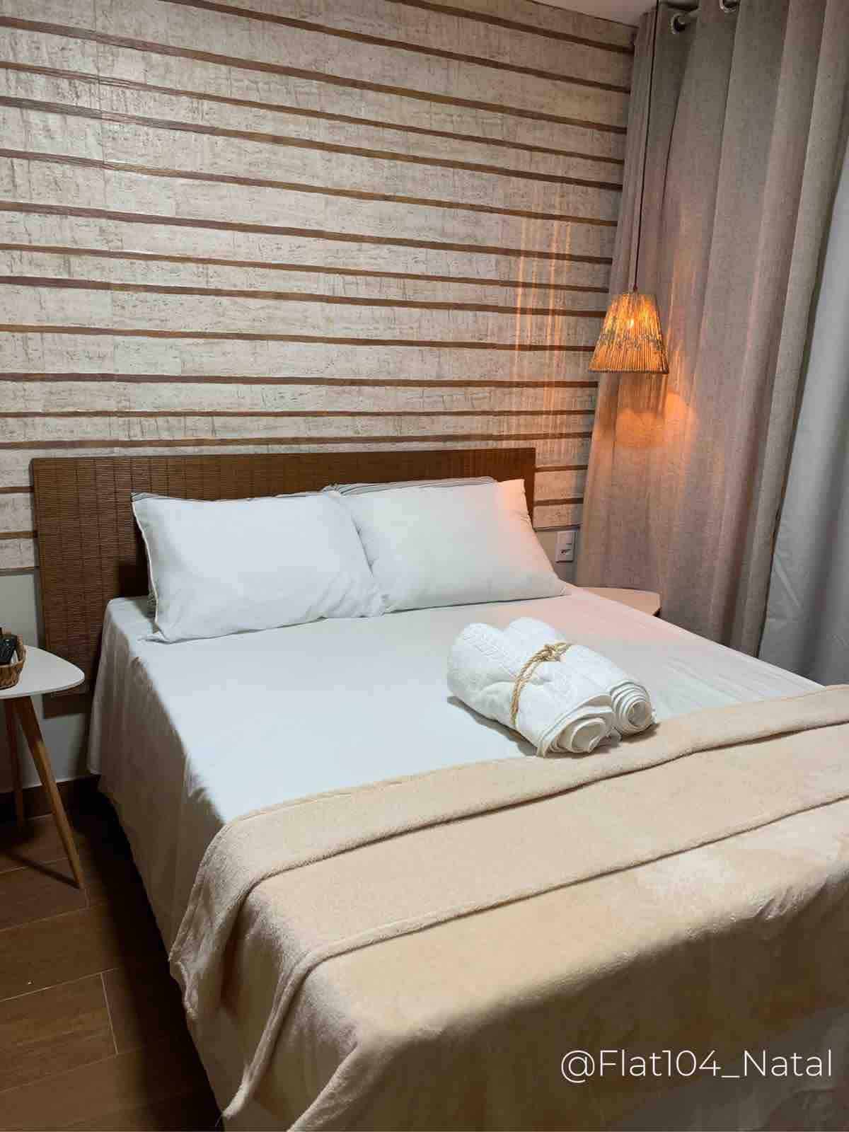 - Flat espaçoso, com 40m2 - A aproximadamente 300m da Praia de Ponta Negra - Totalmente mobiliado, decorado, com iluminação e móveis projetados; -Cozinha equipada com: cooktop, microondas, liquidificador, sanduicheira, cafeteira e todos os utensílios de cozinha - Sala de estar: sofá, mesa para refeições com 4 cadeiras, armário e ventilador - Smart TV 4K 43" (giratória permitindo acesso ao quarto ou sala de estar) - Wi-fi - Ar-condicionado - Varanda - Cortina blackout