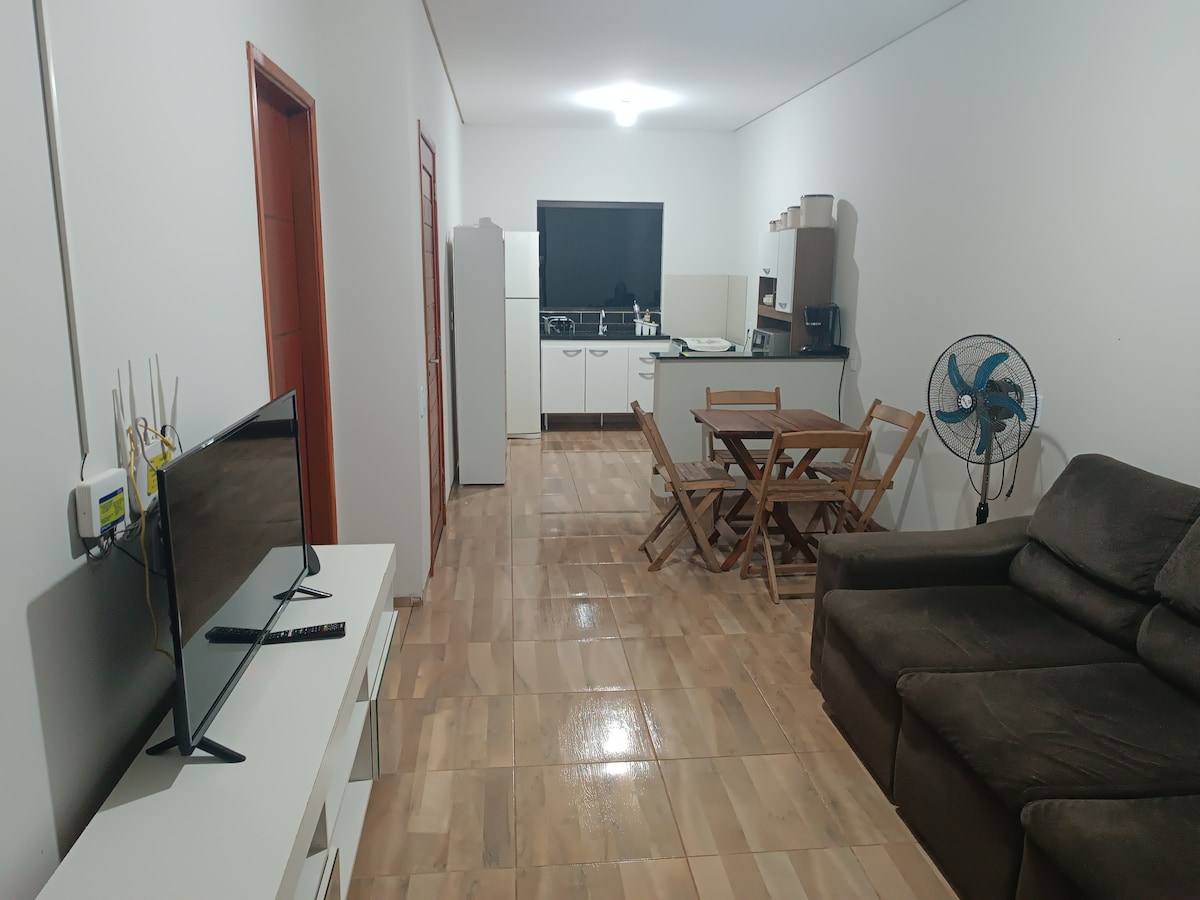 Espaço aconchegante, com tudo que precisa para relaxar ou trabalhar. Projetado para 4 pessoas, conta com um quarto com cama de casal com ar condicionado, mais um sofá cama na sala que acomoda 2 pessoas, enxoval completo, uma sala ampla, mesa para refeições, uma cozinha completa, churrasqueira, garagem para um veículo, máquina de lavar roupa. Próximo a Farmácia, Supermercado, Padaria, Restaurante, Hospital, Centro de Convenções, Horto. Relaxe com toda a família nesta acomodação tranquila.