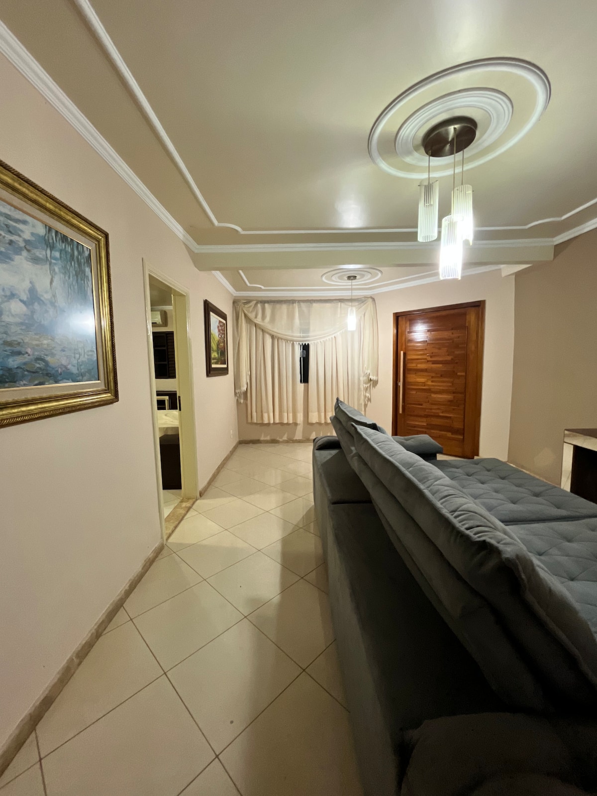 Comodidade ofertada - fica a 30 metros do aeroporto de Ponta Porã; Os 2 maiores shoppings da fronteira estão a 900 mts. TV a cabo. Toalhas, jogo de cama. -2 quartos, 3 sofás, uma mesa para 6 pessoas, forno, microondas, geladeira, talheres, tudo o que você precisa! Ar condicionado na sala e em um dos quartos, no segundo temos um ventilador. Estarei presente a todo momento que precisarem de qualquer auxílio. Desembarque do aeroporto a pé, ande 30 metros e chegará aqui neste lar de paz.