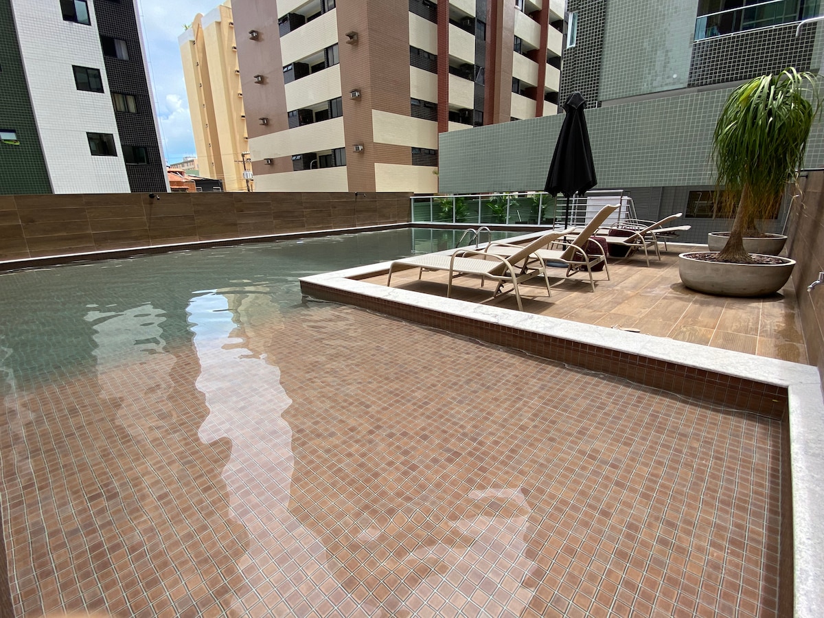 Sua família na melhor localização de Maceió! Apartamento Studio a 200m da belíssima praia de Ponta Verde. Edifício conta com restaurantes, lavanderia, conveniência, bar, cafés e padaria. Além disso, está próximo de supermercados, farmácias e tudo que você e sua família precisam. Apartamento acomoda até 4 pessoas com conforto, com 2 camas Queen, TV, Wifi, ar-condicionado, armários e cozinha completa com utensílios. Edifício possui piscina, salão de jogos, sauna, Jaccuzzi, academia e lounge.