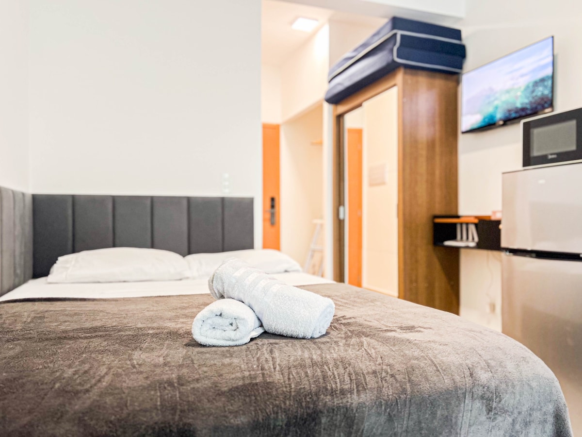 Come and enjoy comfortable and friendly accommodation on the seafront in Matinhos. Located on the seafront avenue, practically with your feet on the sand. This beautiful Studio offers: • Air conditioning; • Smart TV; • Minibar; • Microwave; • Electric cooktop; • Oven; • Electric Kettle; • Electric sandwich maker; • Blender; • Hairdryer; • Iron; • Guitar; • Kitchen utensils. We do not provide bath towels or bed linen, guests must bring them.