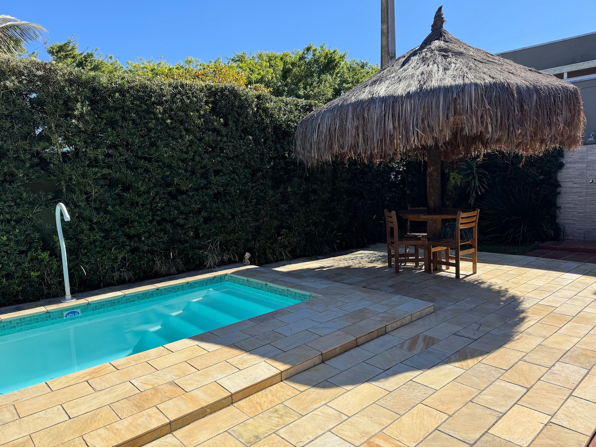 Linda casa recém-construída. A casa acomoda até 10 pessoas com conforto. Temos à disposição uma suíte com cama de casal, closet e equipada com um ar-condicionado, mais um quarto com 2 beliches e ar-condicionado e um terceiro quarto com 2 beliches e ventilador. A casa tem mais um segundo banheiro. A sala principal tem um pé direito alto com cozinha e sala de jantar anexas e mezanino. A área externa tem uma churrasqueira,duas redes. O pátio acomoda 2 carros. A praia fica em cerca de 300m.