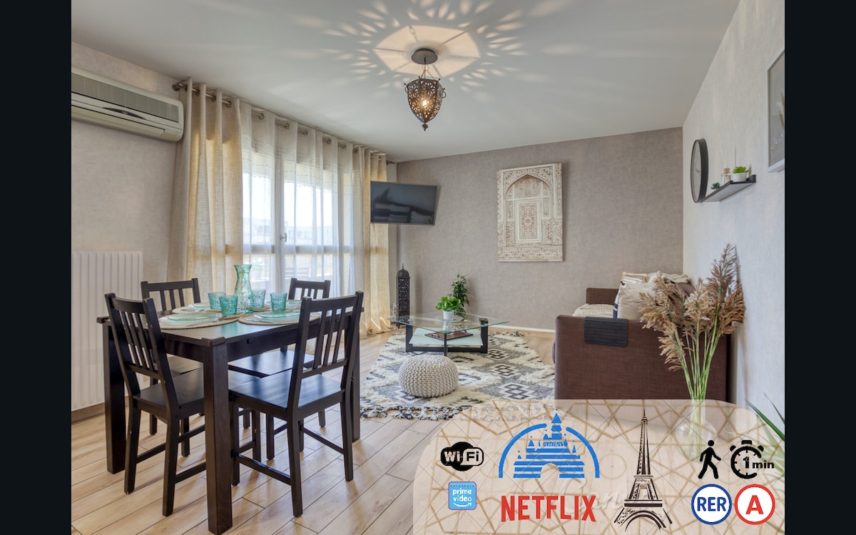 Superbe T3 refait à neuf, moderne et lumineux, offrant jusqu’à 6 couchages. Situé dans un quartier pavillonnaire très calme, à proximité de Disneyland Paris, de la Gare RER E (direct Paris Saint Lazare en 30min), de différents commerces (boulangerie, primeur, poste, supermarché, restaurants...) et de grands espaces verts (parcs, forêt, terrain de pétanque). Idéal pour un couple avec ou sans enfants, une famille ou entre amis pour visiter Paris, Disneyland, Val d'Europe ou la Seine et Marne.
