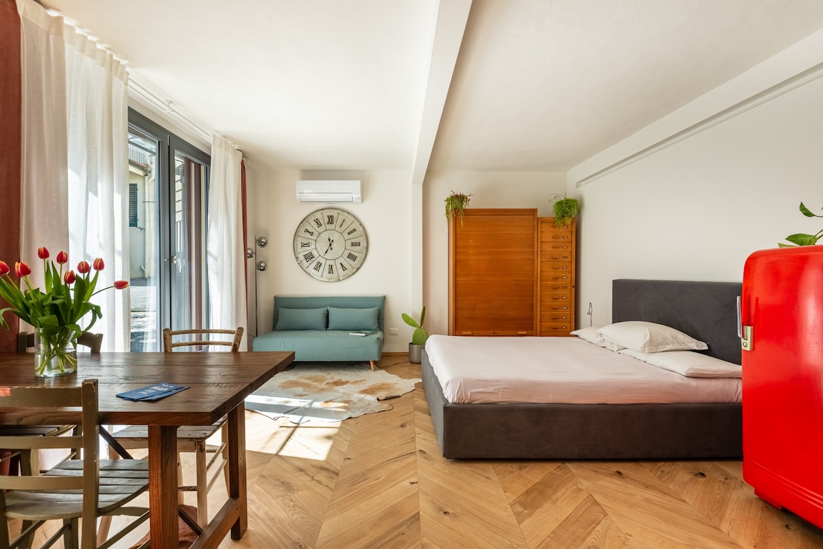 Monolocale al piano terra, si trova in una bella casa, nel cuore delle Cure, tranquillo quartiere di Firenze. Appartamento Fonderia è raccolto in un unica stanza completa di tutto, microonde/forno, frigorifero, lavatrice, lavastoviglie e bagno con doccia. È arredato in uno stile immacolato e contemporaneo. Wi-fi e , 1 Posto auto gratuito, 2 biciclette uso gratuito non assicurate Il letto è matrimoniale + 1 divano letto a una piazza e mezzo adatto a bambini. 2 bici disponibili