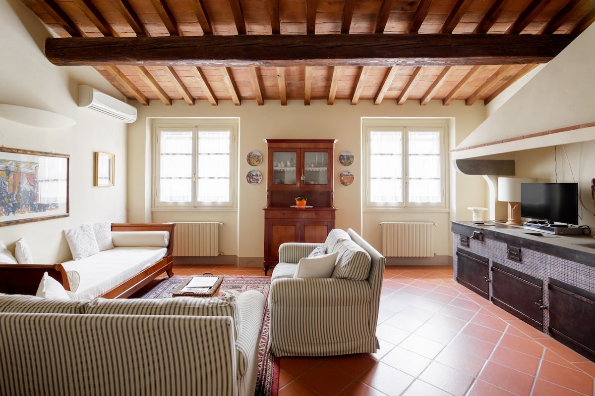 In the heart of Florence, in front of Palazzo Pitti, "la casina di via maggio" welcomes you. We are Silvia and Giacomo. I am a teacher, Giacomo is an actor. We were both born in Florence. The casina is a first floor Renaissance-style open space, arched ceilings, quiet and well-air-conditioned. It's not bright; there's only one window overlooking an internal courtyard. The building dates back to the 15th century. Just steps from Piazza Pitti and Ponte Vecchio. The ideal base to visit Florence.