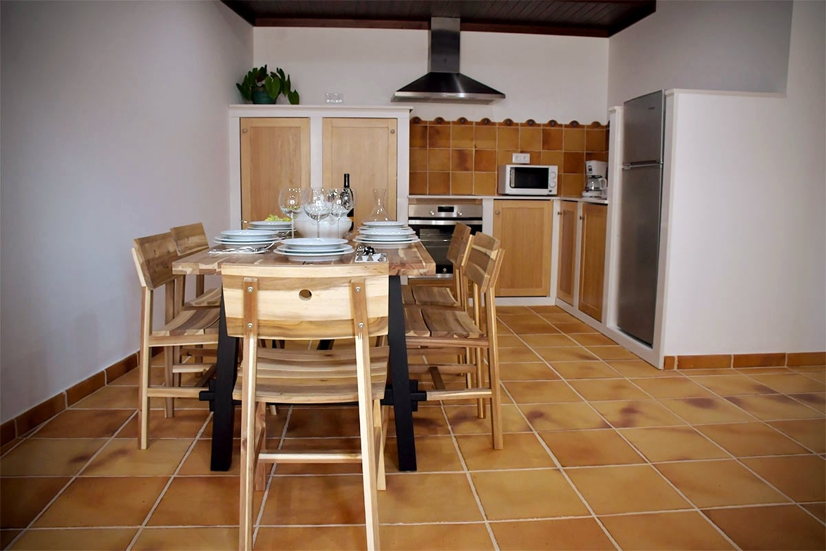 FLAT OF 47 M². KITCHEN: Kitchen, spacious and cosy. 2 BEDROOMS: one single room with a large 110 cm bed, and another double room with either two 90 cm single beds or a 180 cm bed. 1 LIVING ROOM: equipped with a 1.35 cm sofa-bed. With a large terrace. 1 very spacious BATHROOM with shower with the same Breda stoneware floor, unobstructed, with glass screen. VIEWS to the garden and nearby orchards, green area in the centre of the village.