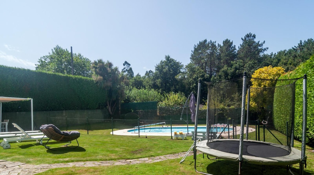 Chalet en entorno rural, completamente nuevo y moderno, 1200 m de jardin con piscina,zona de barbacoa y mesa de pingpong. Ideal para parejas, familias y grupos. Muy bien comunicada con una vía rápida para las zonas de playas(Sanxenxo, A Lanzada, O Grove, Combarro, Isla de Arousa..) y ciudades como Santiago de Compostela. Está a 5 minutos de la ciudad de Pontevedra. Muy cerca disponen de un centro hípico y diversos furanchos(comida típica) para comer. Posibilidad de alojar hasta 12 personas.