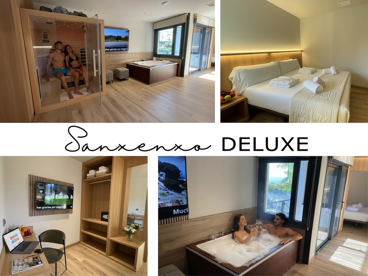 Forma parte del exclusivo complejo de apartamentos del Edificio Sanxenxo Deluxe, diseñado para alojar cómodamente hasta cuatro personas. Cuenta con hidromasaje privado y sauna seca, dos terrazas privadas —una con acceso directo a la piscina del complejo— y una ubicación privilegiada frente a la playa de Baltar en Sanxenxo. Ideal para familias o parejas que buscan relax y proximidad a la playa, con WiFi de alta velocidad, climatización y Smart TV disponibles en el complejo.