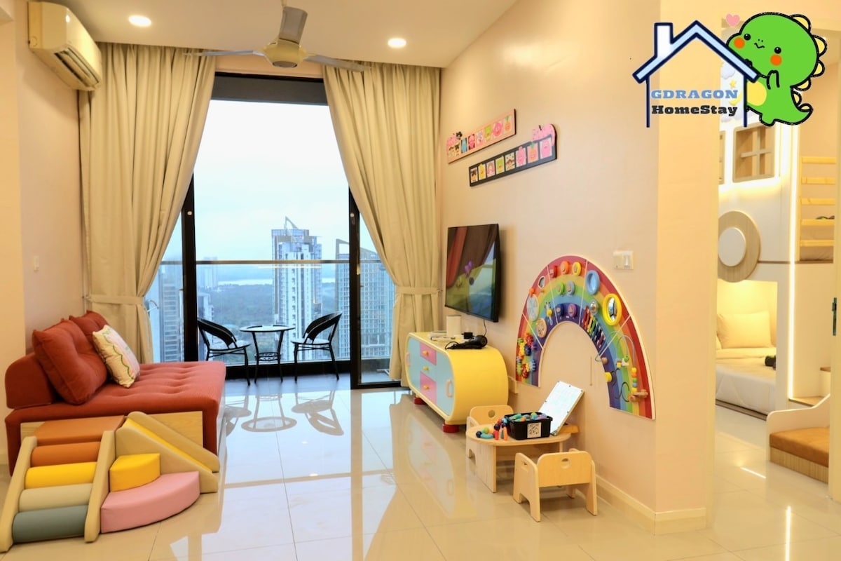 Modern design and comfortable Ultimate Kids-Friendly Haven Airbnb Experience - Bedroom: Loft Bedroom with Slides -Queen Size Mattress × 2 Within walking distance to Legoland and Gleneagles Hospital, we offer easy unwinding for adults while kids invent their treasured memories . -Kid & Baby-Friendly Bed with Slides, kitchen Toys -Balcony Private view