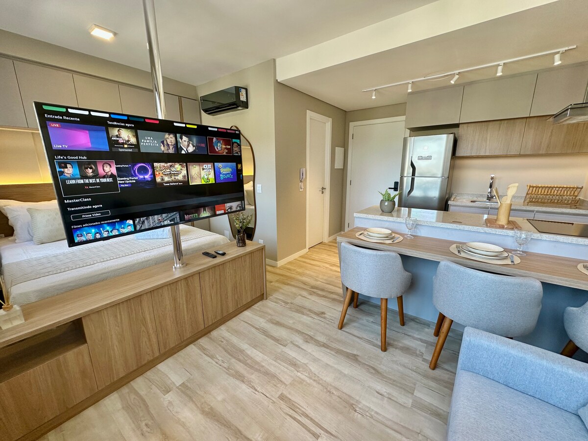 Viva uma experiência única neste estúdio acolhedor e elegante, projetado com atenção aos detalhes para oferecer conforto, funcionalidade e muito estilo. O ap azul planejado é um diferencial exclusivo, com iluminação suave e decoração pensada para relaxar, móvel inteligente e versátil que se transforma em mesa de jantar ou apoio para cozinhar — perfeito para quem valoriza funcionalidade. Piano digital disponível para relaxar, praticar ou se inspirar. Smart TV, Wi-Fi.