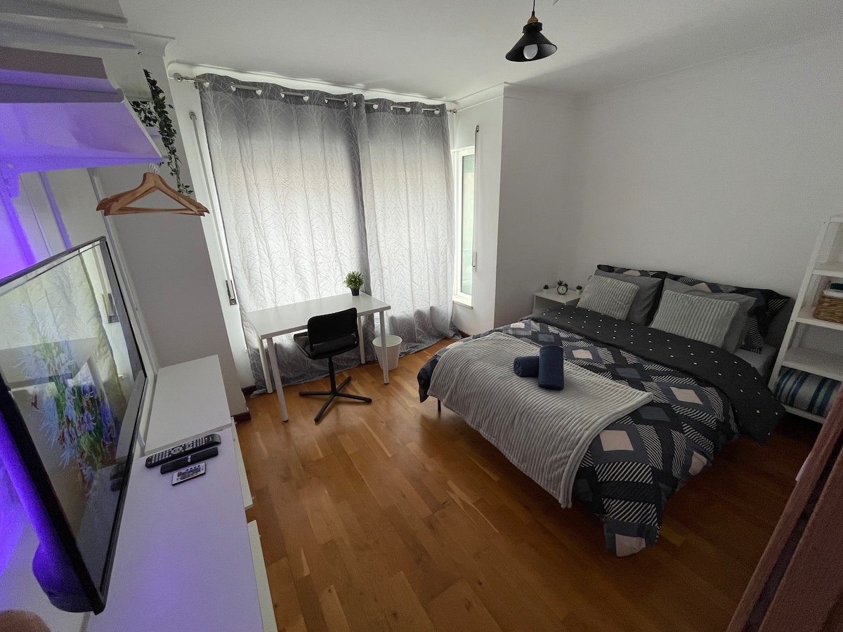 Independent part of appartment with one room a kitchen, small living room and wc. With all the amenities for a confortable stay this quiet independent part of appartment is ideal for a couple or a single person. Its located near the Gulbenkian museum, Praça de Espanha and Sete Rios area. With wiews to the green belt of Lisbon its served with good public transports, bus in front of the building and metro at less than 10 min walk. There is parking areas around and restaurants.