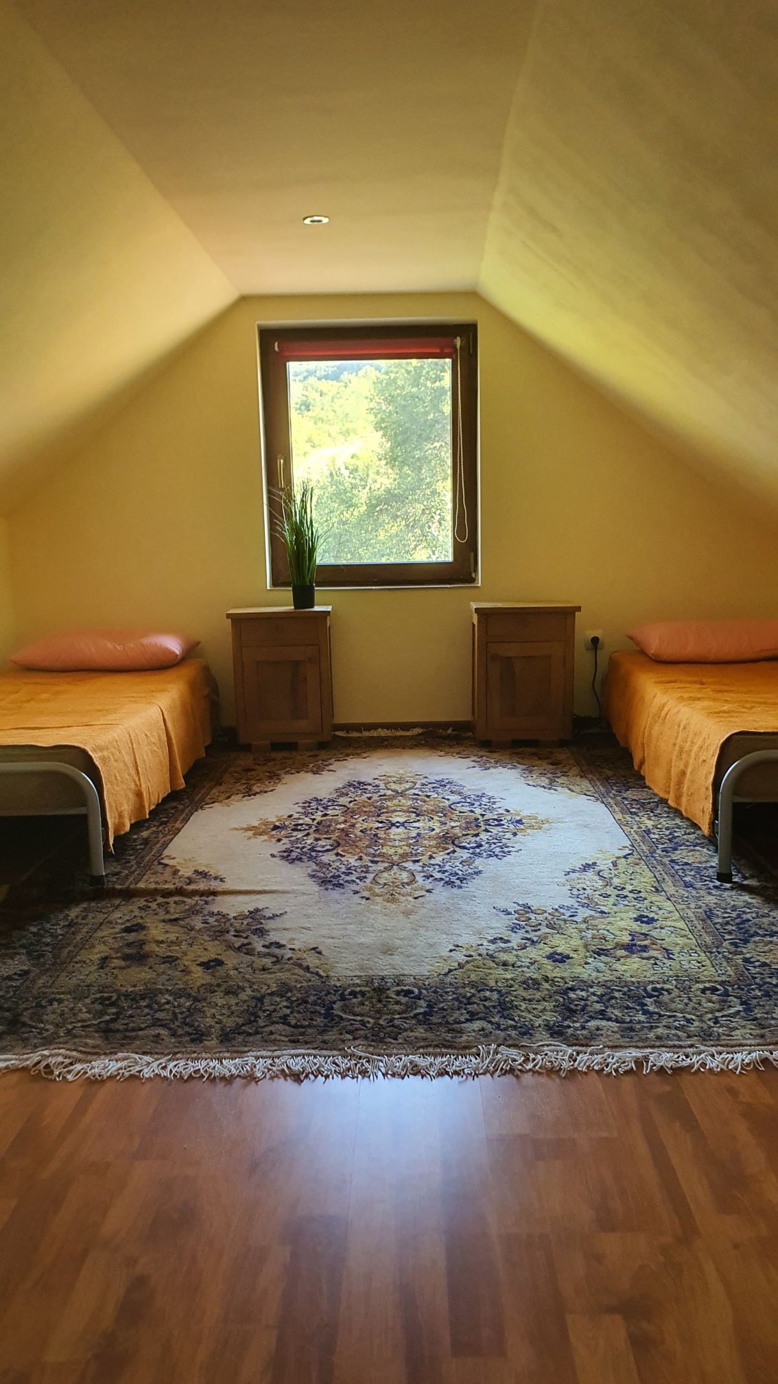 Dacă doriți să vă îndepărtați de zgomotul orașului și să vă odihniți într-un loc liniștit și calm, atunci casa noastră de vacanță este alegerea perfectă pentru dumneavoastră. Clădirea pentru 10-12 persoane se află în munți, într-o vale, lângă un pârâu, astfel încât sunetul apei curgătoare va fi aproape mereu alături de tine în timpul zilelor petrecute aici. Rezervați-vă acum casa noastră de vacanță și bucurați-vă de farmecul oferit de natură!