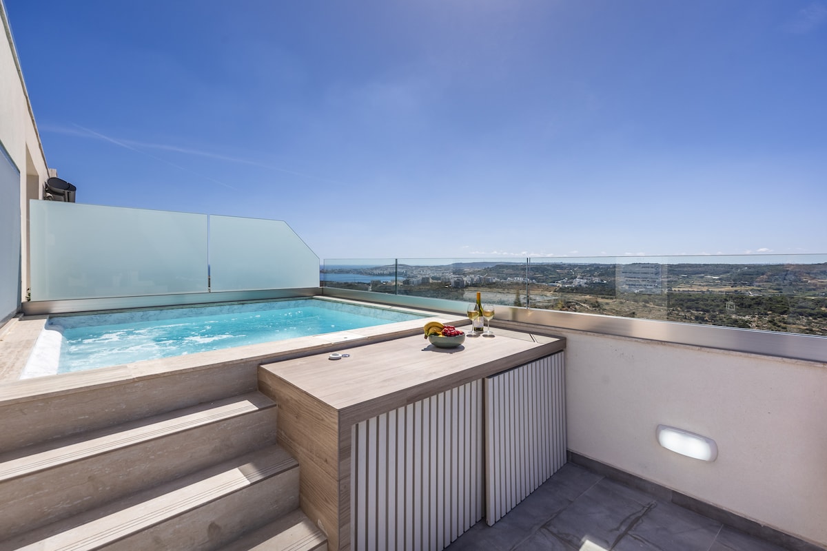 Panorama Lounge is located in the quiet and peaceful village of Mgarr, close to some of the nicest sandy beaches and spectacular sunset spots. The apartment features a private pool (available all year round & heated to an average temperature of 27 degrees celsius) with in-built jacuzzi, as well as a huge terrace with unobstructed countryside views. Panorama Lounge is ideal for those looking for a unique and tranquil getaway.