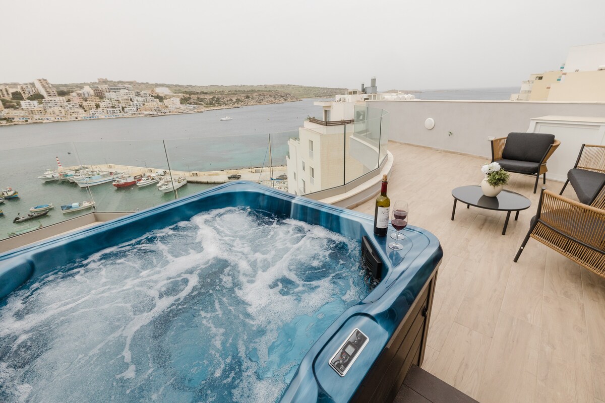 A beautiful, spacious, family and work-friendly, serviced apartment with views in Mellieha's most sought-after residential area. The apartment is fully airconditioned and has a 2/3 seater private jacuzzi on its terrace. Guests also get access to the fully equipped gym in the same building. The apartment is a 15-minute walk to Malta's largest sandy beach (2 minutes by car) and relatively close to all amenities, including supermarkets, shops, hairdressers, etc.