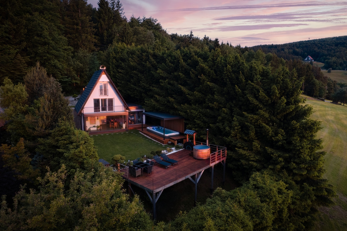带热水浴缸和全景桑拿的度假木屋