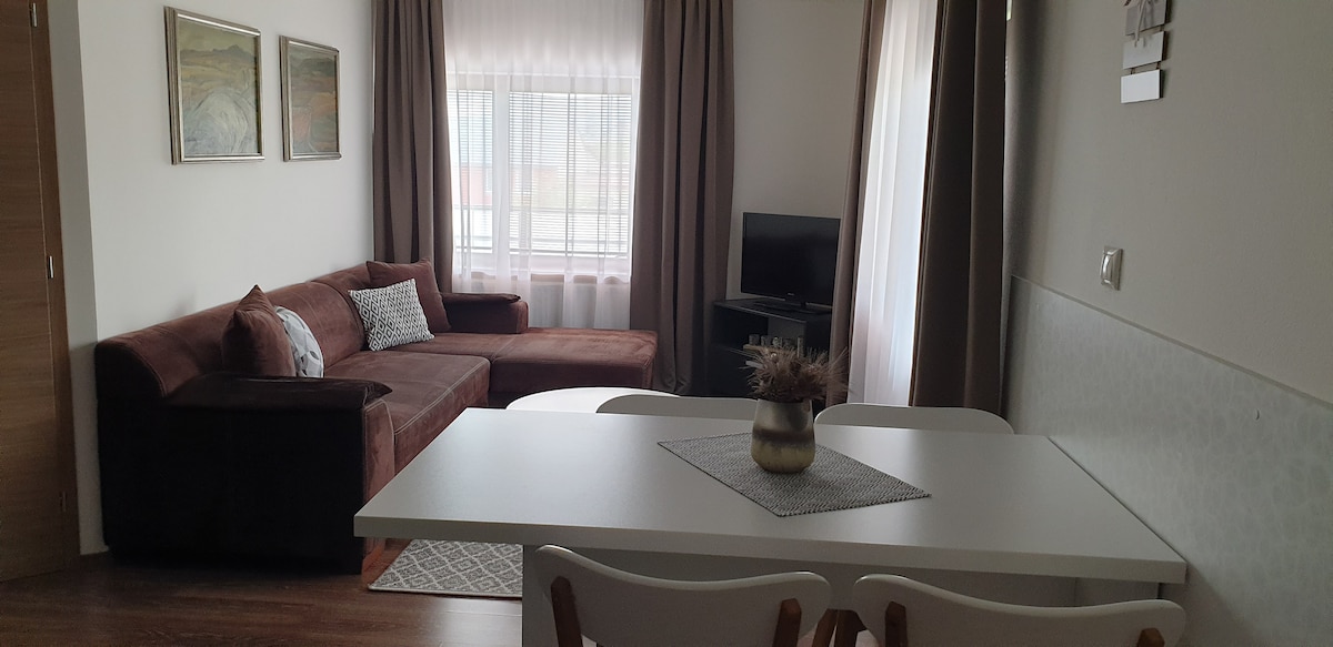 Modern 2-room apartment in the heart of Poprad, 54 m². Features a spacious living room with a pull-out sofa and flat TV with Netflix, fully equipped kitchen, cozy bedroom with generous storage and balcony access, modern bathroom with bathtub. Includes high-speed WiFi and free courtyard parking. Located centrally, with shops, restaurants, cafes just steps away. The aquapark is 750m away, and the train station, offering access to the High Tatras, is a 10-minute walk. Ideal for business or leisure.