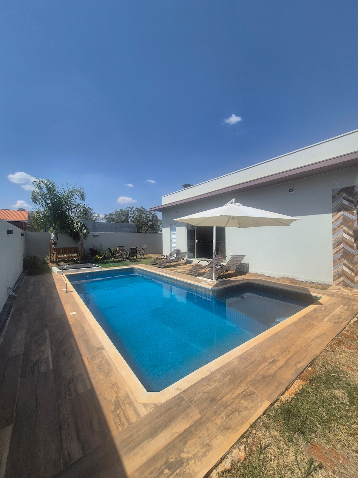 Casa nova, linda e decorada, piscina suspensa (mais segurança para crianças e pets). Em condomínio com segurança 24h. A área conta com 3 quartos, 3 banheiros , 1 cozinha completa, 1 sala, área gourmet equipada com utensílios, 3 TVs (com aplicativos para séries e filmes), eletrodomésticos, lavanderia e um quintal espaçoso com 3 redes disponíveis para relaxar. Todos os quartos possuem ar-condicionado.