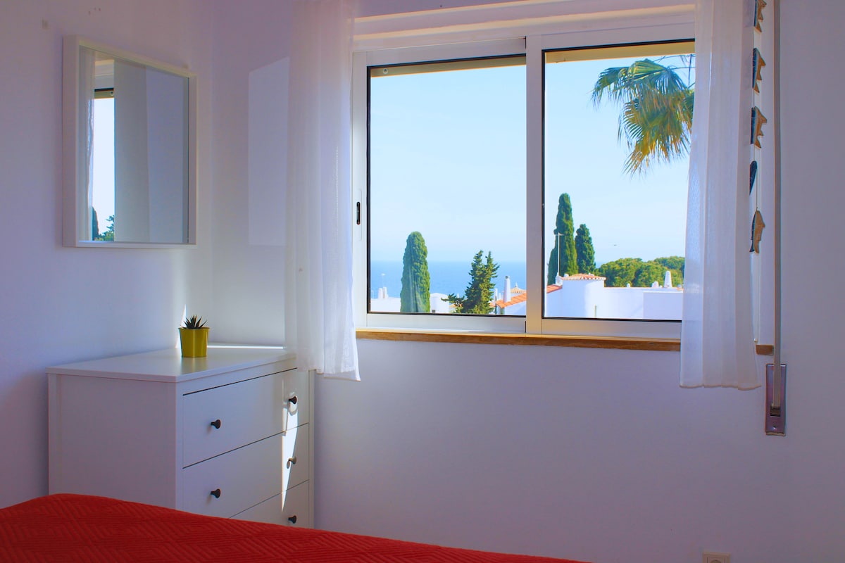 Beachy, artsy vibe near coastal town Armação de Pera. 10/15 min. walk to beaches, cliff paths, town, restaurants, supermarket. Outstanding terrace ocean view, BBQ. Fireplace. A/C in living room and bedrooms. Fully equipped kitchen. Free street parking. Max 4 people. Primary bedroom: queen-size bed. 2nd bedroom: 1 or 2 twin beds. Kids: 5 years +. Nightly rate is base rate for 2 guests; there is an added rate p/person p/night, including kids. For stays of 10+nights, there are added cleaning fees.