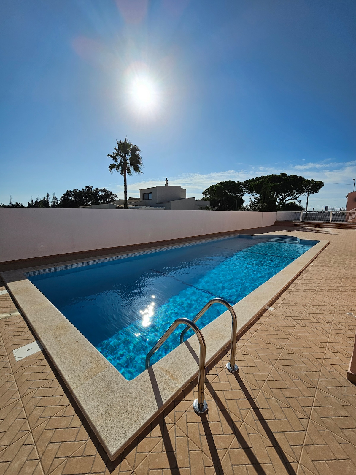 Amazing 180° Seafront view with private heatable swimming pool 2 bedrooms, 1 living room, 1 dining room, 1 fully equipped kitchen, 2 bathrooms, 2 terraces. Recently refurbished and fully equipped. Modern and stylish. Fantastic views over the ocean and Albufeira's beach/city. Private swimming pool with ocean view. Central location. Easy parking. All commodities within 100 meters. 4 minutes walk from the beach. The apartment is on the 3rd (and last) floor of a 3 storey typical Algarvian villa.