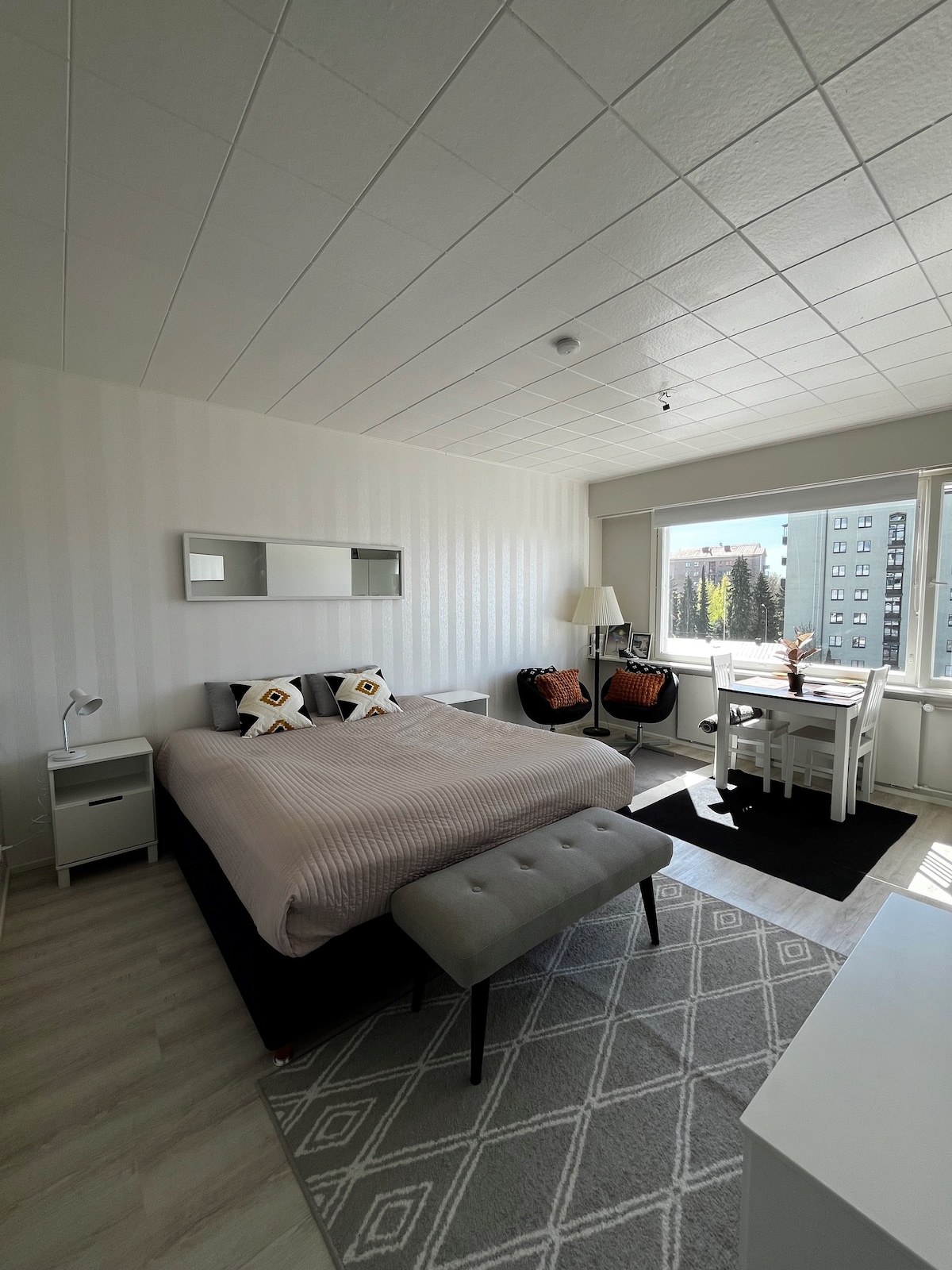 Valoisa yksiö loistavalla sijainnilla aivan Puuvillan kauppakeskuksen ja yliopistokeskuksen vieressä. Jokirantaan on lyhyt kävelymatka ja Kirjurinluoto on lähellä. Asunto on uusi ja hyvin varusteltu, kalusteet, astiat ja perusmukavuudet löytyy. Huoneistossa on parisänky ja kahden hengen vuoteeksi levitettävä vuodesohva. Tarvittaessa käyttöön saa lisäksi varavuoteen yhdelle. Huoneistossa on wifi ja vieraan käytössä on pistokkeellinen autopaikka pihassa. Huoneistoon kuuluu myös oma pieni piha.