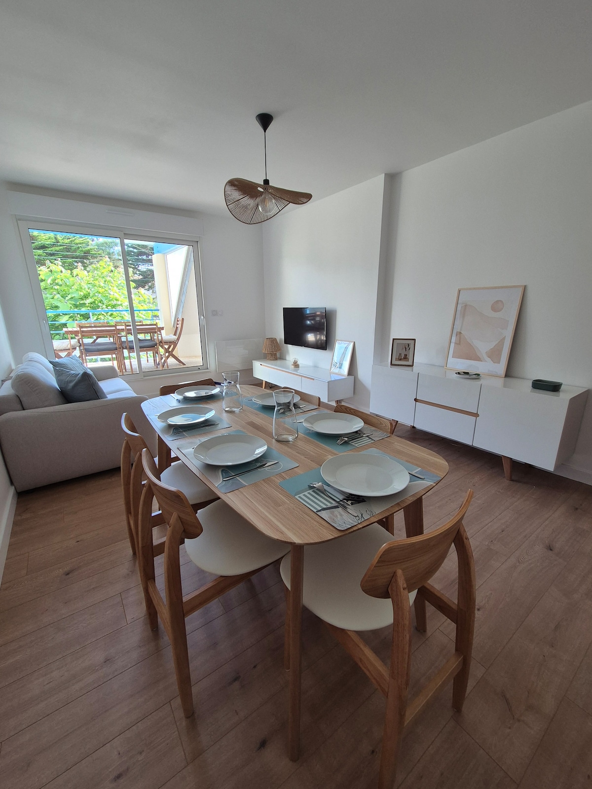 Appartement moderne à deux pas de la plage – Pornichet Bonne Source Venez profiter d’un séjour tout confort dans ce bel appartement T3 de 50 m² entièrement rénové en 2025, situé à moins de 200 mètres de la plage de Bonne Source, dans un quartier calme et recherché de Pornichet. Idéal pour un séjour en famille pour découvrir la presqu’île de Guérande.