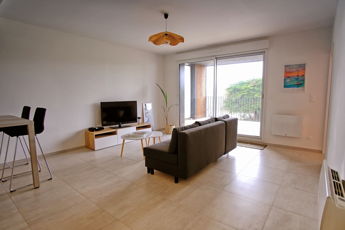 Appart. cosy 25m2 accueillant 4 pers. entièrement refait à neuf, décoré avec soin, très bien équipé (y compris fibre internet wifi très haut débit) .Dans petite résidence au calme avec parking privé, vous êtes à 50m de la plage et du remblai. A proximité de toutes les commodités et les animations vous passerez un séjour agréable, reposant et divertissant. Bien situé vous pourrez découvrir l'ensemble de la côte de jade, de la côte d'amour, le parc régional de Brière et la région Nantaise.