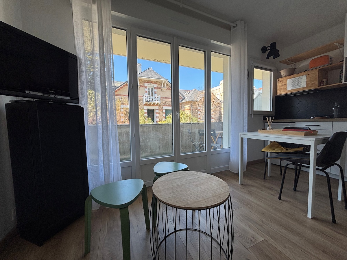 Au cœur de Pornichet, tout à pied. Plage, commerces, marché, restaurants, gare. Résidence face à la très belle plage des libraires … Joli studio cabine, de qualité. Place de parking privative. Dans résidence face mer de standing, très agréable studio donnant sur l’arrière. Très clair et facile à vivre. Venez le découvrir, vous serez enchanté…. Pièce de vie cuisine aménagée, canapé lit de qualité, écran plat, fibre, terrasse. Coin nuit avec lits superposés, placards. Salle de bains avec wc