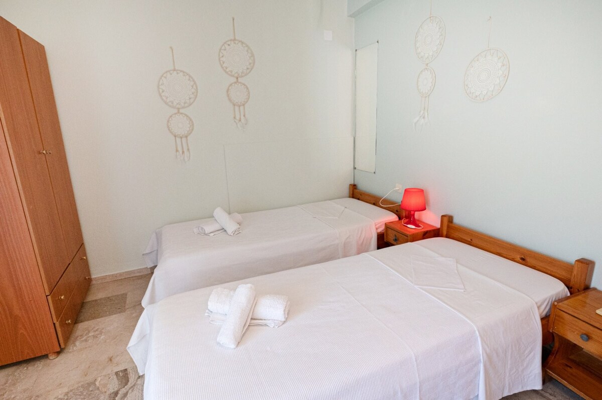 Cozy apartment 2 minutes walk from Askeli Beach Beautiful sea view near to supermarket,bakery and restaurants. 1 big bedroom 1 living room with sofabed - Electric kitchen - Washing machine - Espresso coffee machine - Microwave oven -2x Led TVs -2x AC - Hair dryer - Iron for clothes - WIFI access
