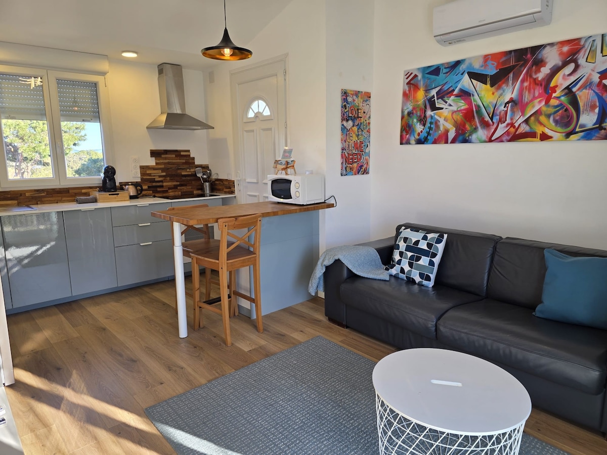 Appartement neuf, climatisé, idéalement situé sur la presqu'île de Giens, 500m à pied des plages de la Badine et de l'Almanarre. Situé au premier étage, il se compose d'une chambre, d'une salle d'eau et de wc séparés, d’une cuisine ouverte sur un salon lumineux et d’une terrasse pour profiter du soleil. Cet appartement est décoré dans un style contemporain. Harmonie entre confort, design et sérénité, pour un séjour détente et nature au bord de la mer. 🚗 Stationnement gratuit dans la propriété