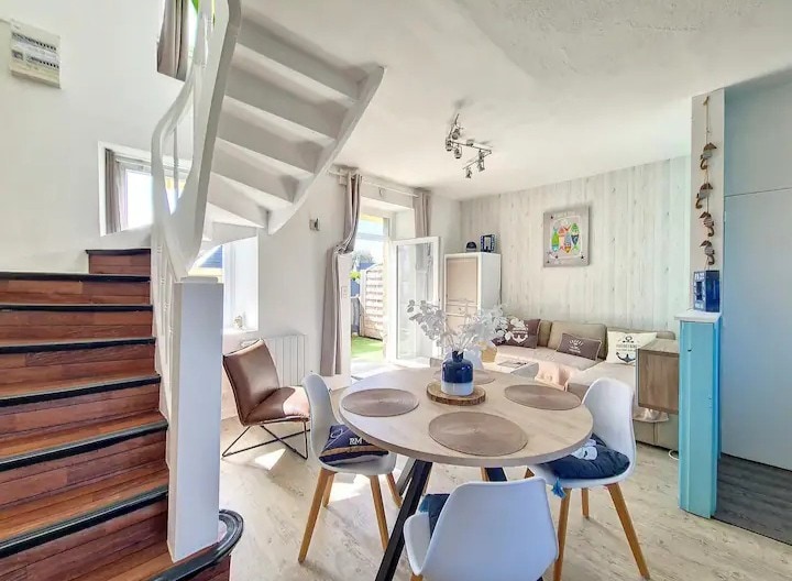 vous disposerez d'une cuisine toute équipée, d'un salon agréable et tv connectée, d’une buanderie . D'une chambre avec 1 lit pour 2 personnes de 1.60 avec sommier motorisé et tv, une chambre avec lits superposé de 2 p. et 1 p et tv. Une salle de douche avec meuble double vasques et miroir Bluetooth, vous apprécierez la terrasse, le jardin. Une borne de recharge pour voiture électrique. Possibilité de sortie en mer (selon la météo et des disponibilités).