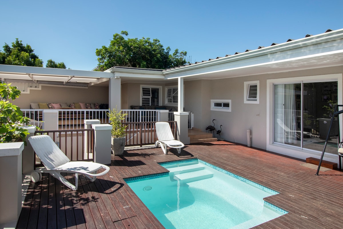 Welcome to The Captain's Cabin - a cosy, self-catering family retreat on a quiet street off Westbourne Road. This secure home features 3 ensuite bedrooms (sleeping 8, including a private flatlet), a spacious living area with a fully equipped kitchen, and a large deck with outdoor dining, plunge pool, and off-street parking. Just a 5-minute walk to town and Bushmans River Sunset Beach, you’ll also enjoy uncapped Wi‑Fi and family TV entertainment.