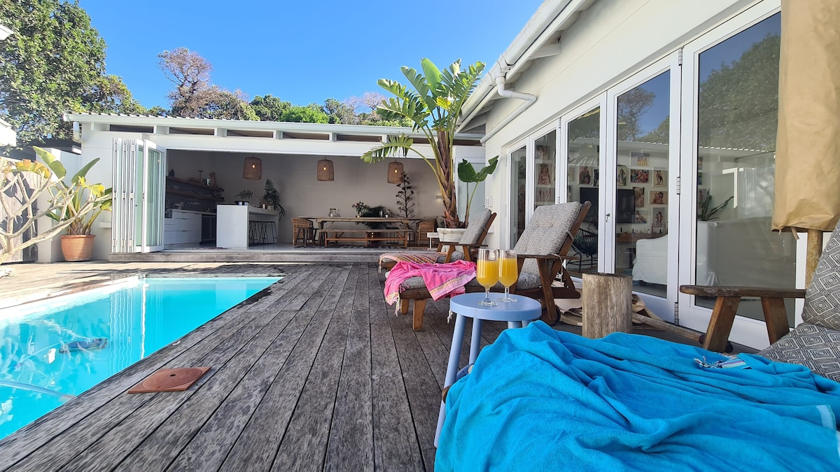Newington House is a short walk from Bushman's lagoon & just off Westbourne rd. Wraparound, covered deck with stunning views of the sea, river mouth & up-river. Swimming pool with awning for shade, two lounges, a sun filled, wind sheltered internal courtyard with fire plinth, braai & weber. A large fenced garden (pet friendly) & outside seating area. Rain Water tanks. Solar power. Alarm, Armed Response, LCD TV, DSTV & Wifi. Flat & cottage (sleeps 7) can be booked for your excl. use for a fee.