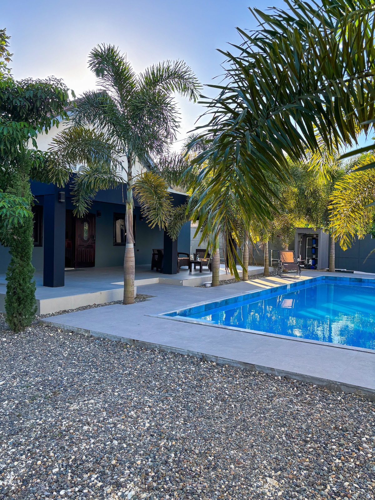 Frangipani is located 5 miles east of Port Antonio, in the lush, rural, tropical subdivision of San San, beside the village of Drapers. It is within walking distance of Drapers, Frenchman's Cove and San San Beach. Port Antonio, Blue Lagoon and Boston Bay are just a few minutes drive away. The property is a self contained apartment and has a 2 lane, 1/3 Olympic length pool, (55 feet/16.6 meters). We offer discounts, 15% for one week, and 30% for one month.