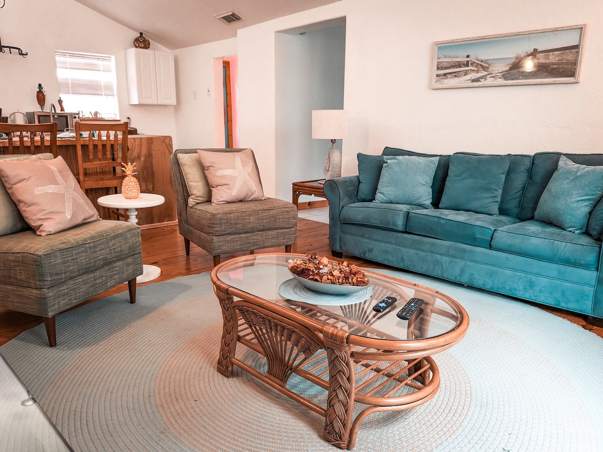 Sleeps 8! Beautiful 2 bed/2 bth beach home in Port A. Relax in the private HEATED pool. Pets Allowed with a fee. Resort-style pool with a waterfall & beach entry, grill on the deck, or rinse off in the outdoor shower. Well-equipped kitchen, plus WiFi & 3 smart TVs. All on one level, a few blocks from the beach & intown. The master bedroom features an adjustable king bed, the second bedroom has a queen and set of bunks & living room has a new sectional sofa w/ sleeper sofa as of Nov. 2025.