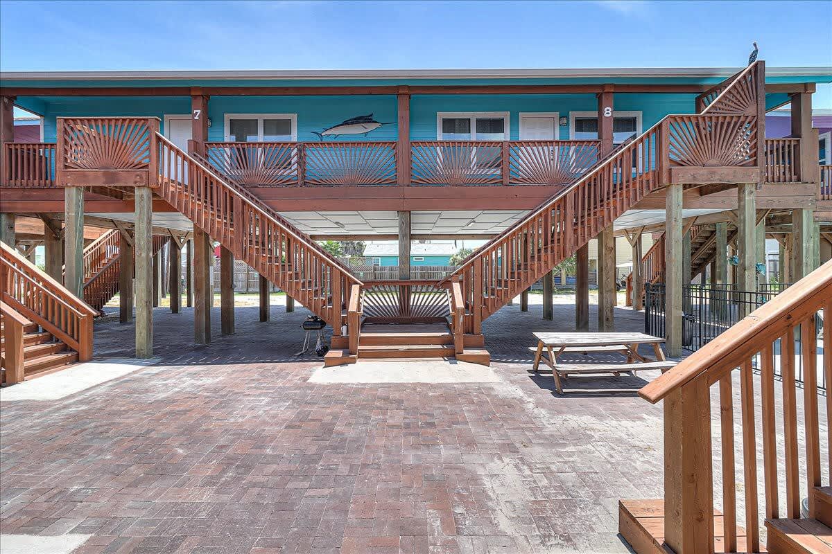 The Darlin' Marlin. Beach House is a 4BR/2BA stilt house in desired beachfront Boardwalk subdivision. 1 block from Port Aransas beach. The Boardwalk beachfront subdivision has the highest observation point deck on the island. Absolutely amazing views, especially at sunset and sunrise! Private pool, Large backyard, boardwalk, full size washer and dryer, WIFI, pet friendly($50/pet per stay). Sleeps 12, golf cart friendly zone(discount at Island Outfitters tx when staying). Up to 6 parking spots