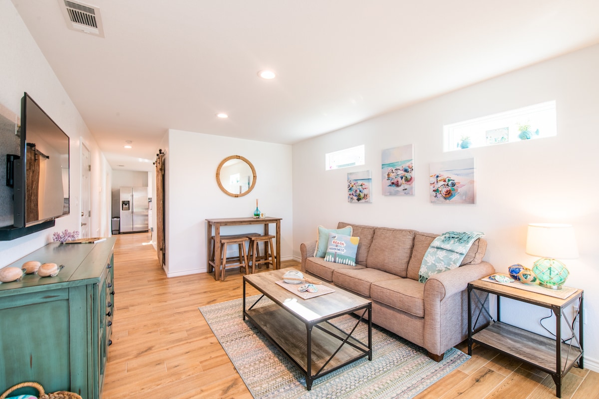 Sleeps 8! Beautiful 2 bed/2 bth beach home in Port A. Relax in the private HEATED pool. Pets Allowed with a fee. Resort-style pool with a waterfall & beach entry, grill on the deck, or rinse off in the outdoor shower. Well-equipped kitchen, plus WiFi & 3 smart TVs. All on one level, a few blocks from the beach & intown. The master bedroom features an adjustable king bed, the second bedroom has a queen and set of bunks & living room has a new sectional sofa w/ sleeper sofa as of Nov. 2025.