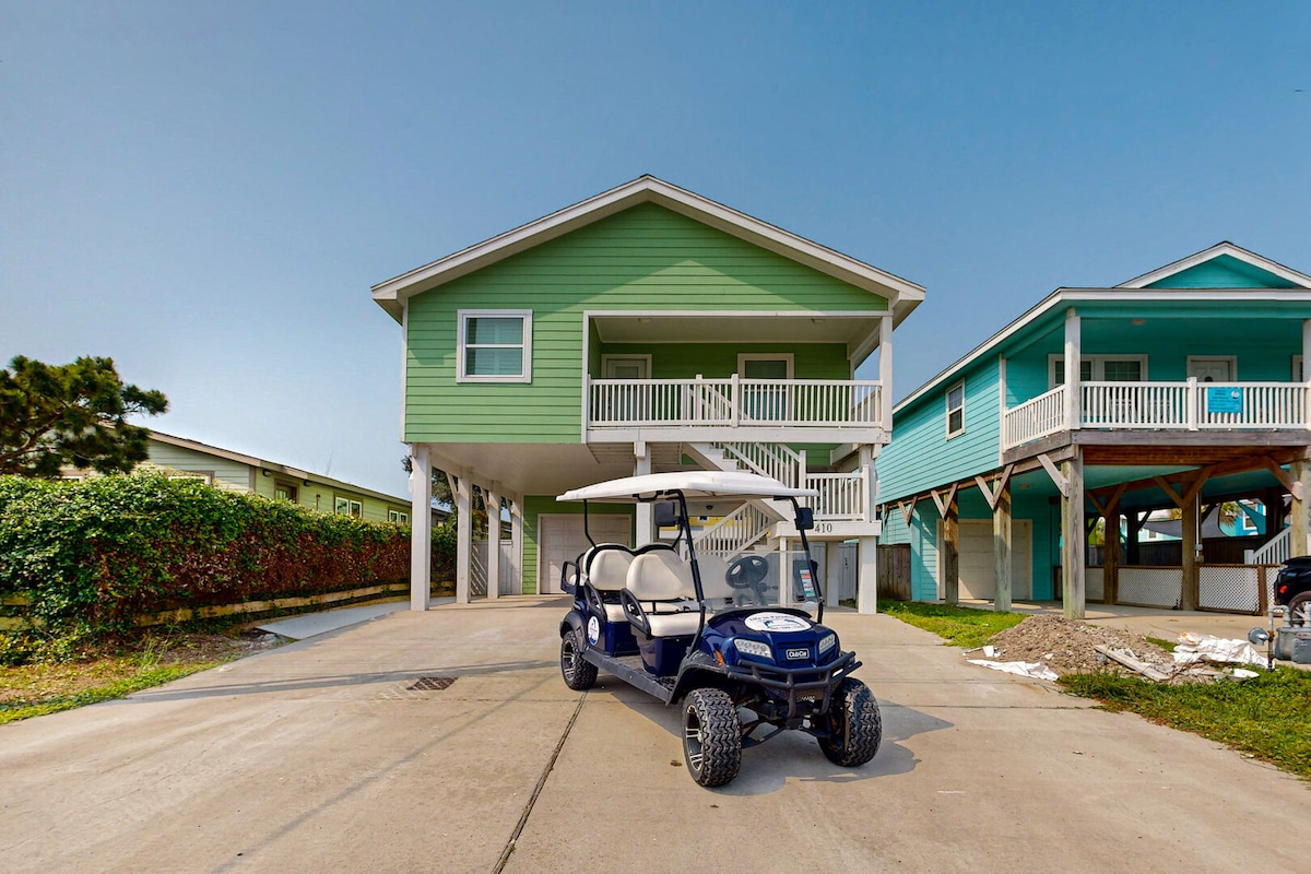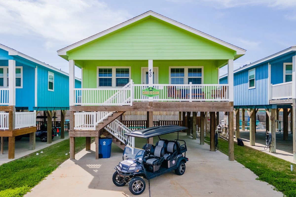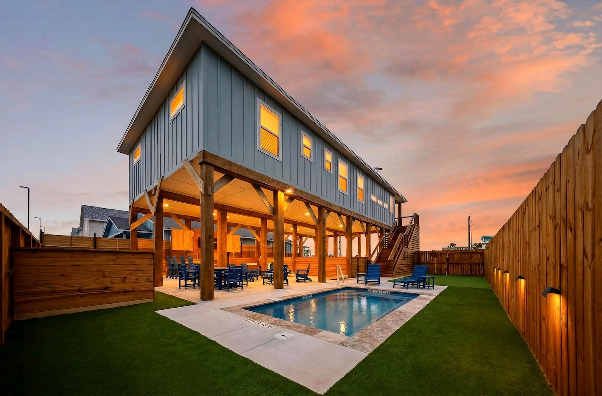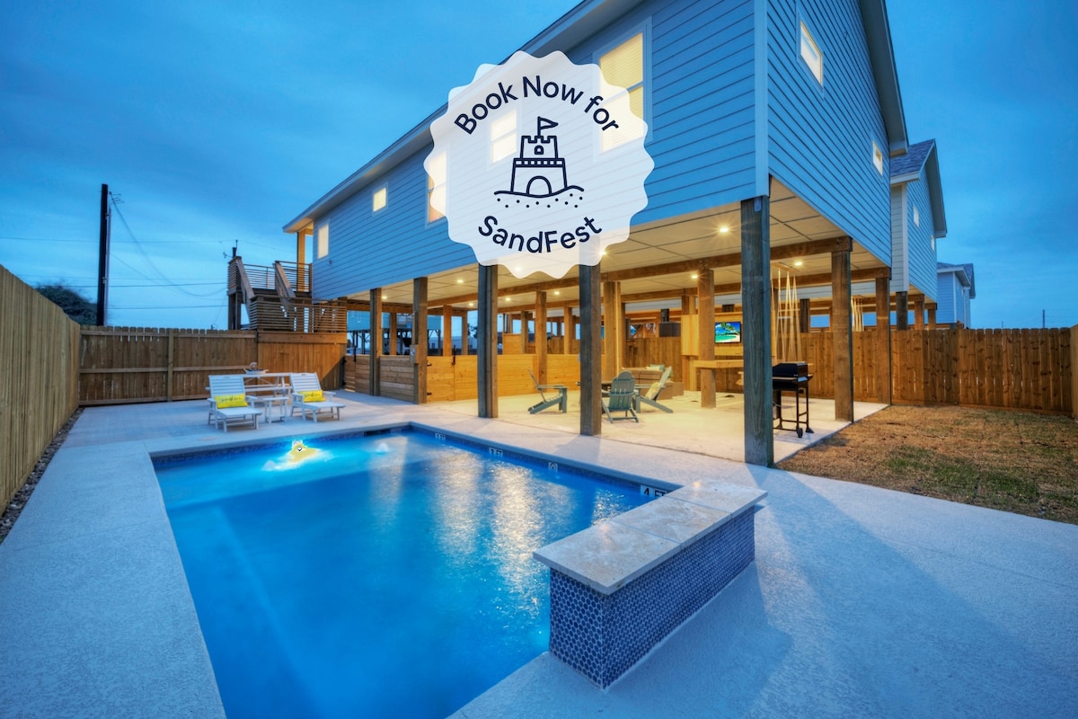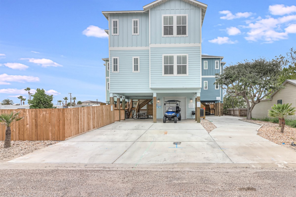 Come make memories at this unique, family-friendly oasis! This retreat promises a luxurious beach vacation! Upscale living, this is simply the finest house in Port Aransas. ~Free Golf Cart ~Very close to the beach ~Private Heated Pool ($50 per day additional cost to heat the pool) ~Fire Pit with wood and s'mores included (November to April) ~Located in the quiet part of town ~Walk to all the restaurants ~Huge outdoor TV with Sonos Soundbar ~Lawn games (Cornhole, Mini Golf) ~Keyless Entry