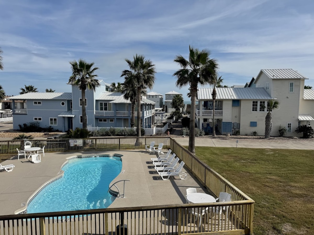 Quiet corner unit w/water and sunset views from large private balcony. 2nd floor unit with no one above. 2 bdrm/1 bath with 2 king beds, 1 queen bed & porta crib. Semi-private entrance w/only 3 other units. Well-lit and secure. Close parking. Only steps from the pool and the bar bq pavilion. Private walkway to the beach & seawall. Walking distance to Brewster Street Ice House w/live music. A great place to get away, relax & make memories with your loved ones. Winter Texans welcome.