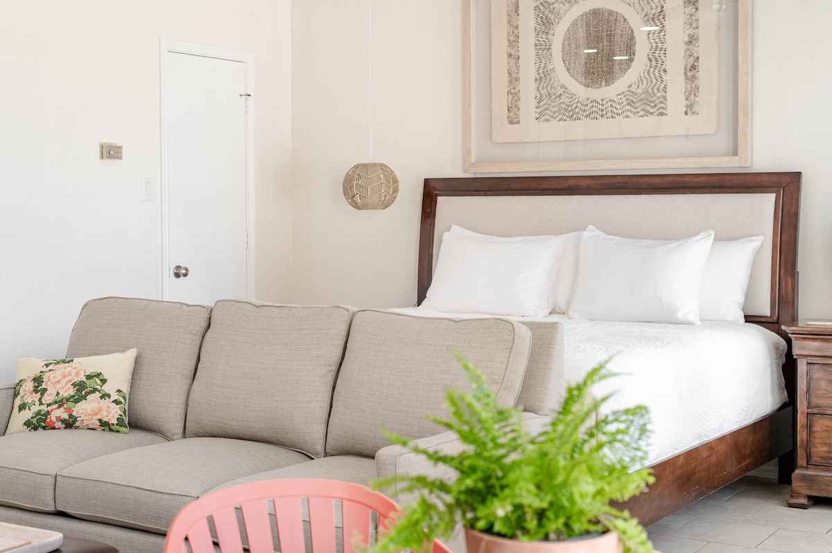 A short walk from the beach, come enjoy your stay at this cozy ocean view retreat. Sip your cup of coffee or enjoy a nice dinner while watching the sunrise/sunset on the balcony. This cute little gem is close to many bars/restaurants. Golf cart available and recommended at the lowest rate on the island with condo rental. This 1/1 king suite has a brand new memory foam mattress, a futon couch/bed, & 2 smart TV’s. Beach chairs and equipment included.