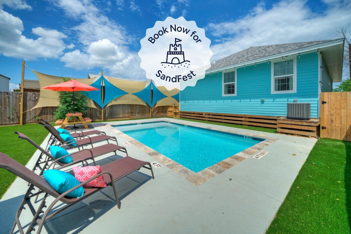 Come make memories at this unique, family-friendly oasis! This retreat promises a luxurious beach vacation! Upscale living, this is simply the finest house in Port Aransas. ~Free Golf Cart ~Very close to the beach ~Private Heated Pool ($50 per day additional cost to heat the pool) ~Fire Pit with wood and s'mores included (November to April) ~Located in the quiet part of town ~Walk to all the restaurants ~Huge outdoor TV with Sonos Soundbar ~Lawn games (Cornhole, Mini Golf) ~Keyless Entry