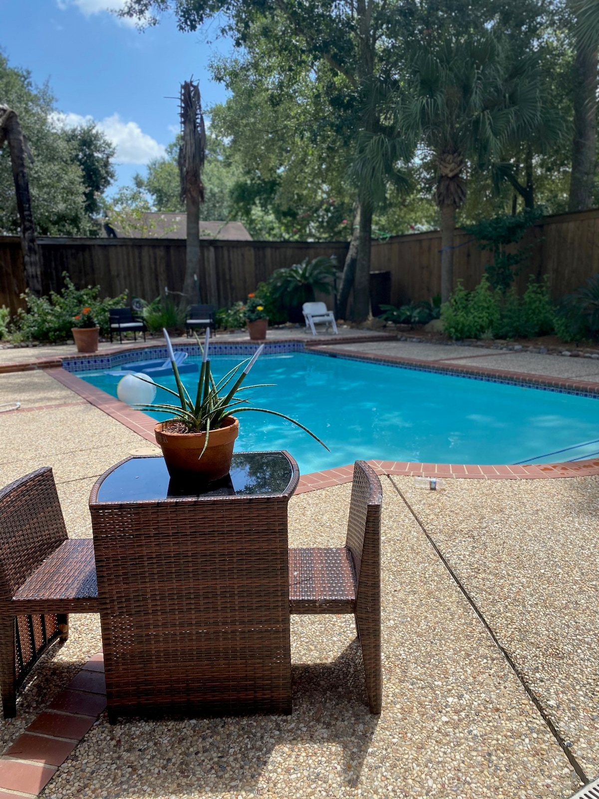 A Westend Condo, a creatively curated haven for art lovers & peaceful getaway seekers! •Features local artists' work • Cowboy stock tank pool for cooling off • Fully equipped kitchen • High-speed WiFi • In-unit laundry • Garage parking w/EV charging available(must request prior) Perfect for art lovers, business travelers & couples exploring Southeast Texas. Short drive to Art Museum of Southeast Texas, Tyrrell Park, Cattail Marsh, and Neches River. Book now for your Beaumont adventure!