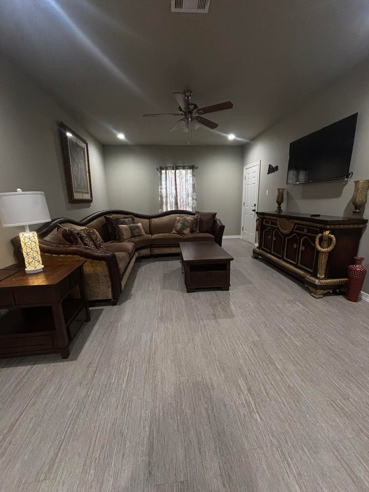 This beautiful 3-bedroom home boasts 2 full bathrooms, a spacious 2-car garage and accommodates up to 8 guests. The living room features high vaulted ceilings complemented by a cozy gas fireplace, while the serene backyard patio offers a comfortable sectional, a gas fire pit, a BBQ grill, and a large TV. Ideal for families and professionals seeking a more comfortable and spacious alternative to a hotel room, and conveniently located just minutes away from major stores, restaurants and hospitals.