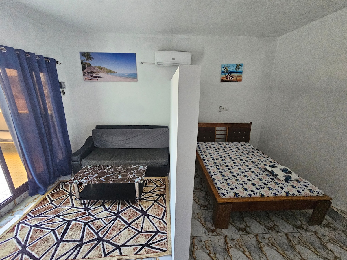 Beau studio sécurisé avec gardien de jour et de nuit.Accès facile Rez de Chaussée avec ouverture sur une petite terrasse. il dispose d'un grand écran de 55 pouces, un coffre fort, une enceinte Bluetooth avec un son de qualité Harman/kardon, un lave-linge, un fer à repasser , Robot aspirateur , assistant Vocale connecté , purificateur d'air et autres équipements. Le sol de la chambre est vêtu d’un parquet flottant