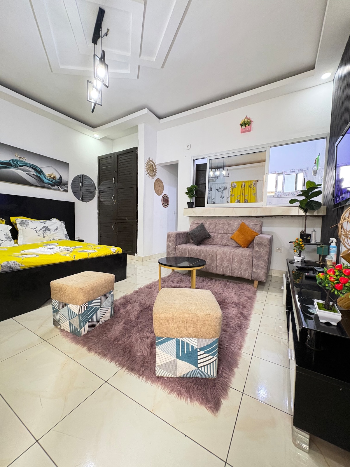 Au coeur de Cocody, entre le Vallon et la Riviera 2, proche des jardins de l'université, découvrez une charmante petite maison de type extension en géo-béton (briques de terre crue). L'appartement dispose d'une chambre climatisée, 1 salle de bain, d'un canapé convertible en lit, d'une terrasse extérieure, et d'un accès illimité à la piscine et au jardin! Vous profiterez de tout le confort moderne d'un logement calme, propre, et bien aménagé.