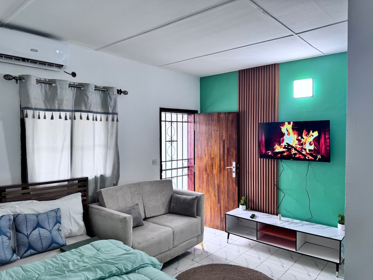 Au coeur de Cocody, entre le Vallon et la Riviera 2, proche des jardins de l'université, découvrez une charmante petite maison de type extension en géo-béton (briques de terre crue). L'appartement dispose d'une chambre climatisée, 1 salle de bain, d'un canapé convertible en lit, d'une terrasse extérieure, et d'un accès illimité à la piscine et au jardin! Vous profiterez de tout le confort moderne d'un logement calme, propre, et bien aménagé.